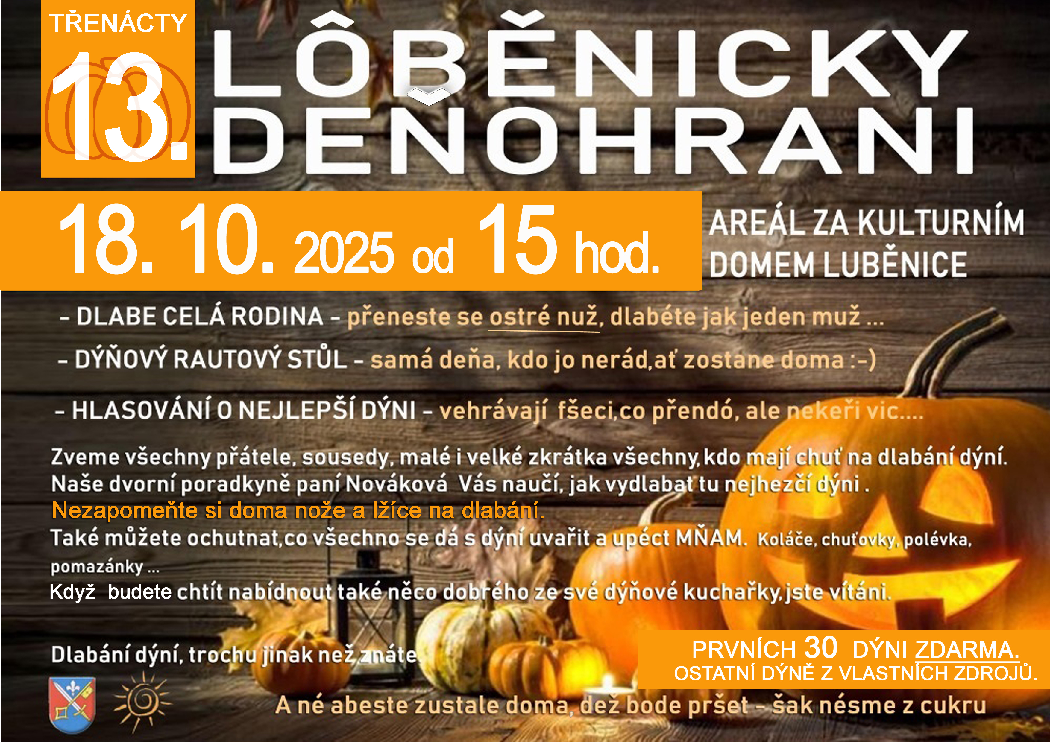 Už po třinácté Vás všechny zveme na tradiční podzimní akci. Rautový stůl plný dýňových dobrot připravují rodiče našich dětí a zaměstnanci školky. Obec Luběnice, sportovní kluby a dobrovolní hasiči podporují akci finančně. To je krásná spolupráce všech. Moc děkujeme a ...