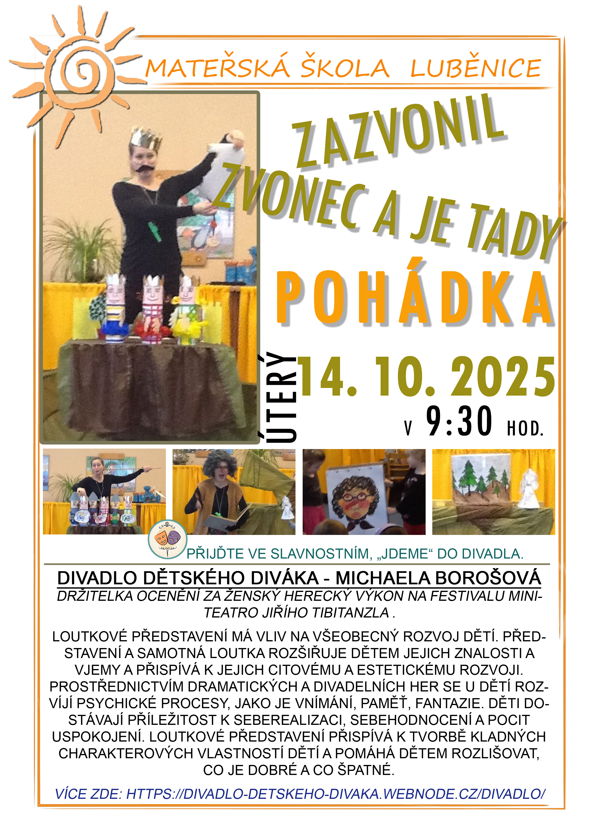 Další z řady skvělých představení Divadla malého diváka paní Michaely Borošové. Z dětí se stávají herci, zpívá se a tančí. Těšíme se moc.